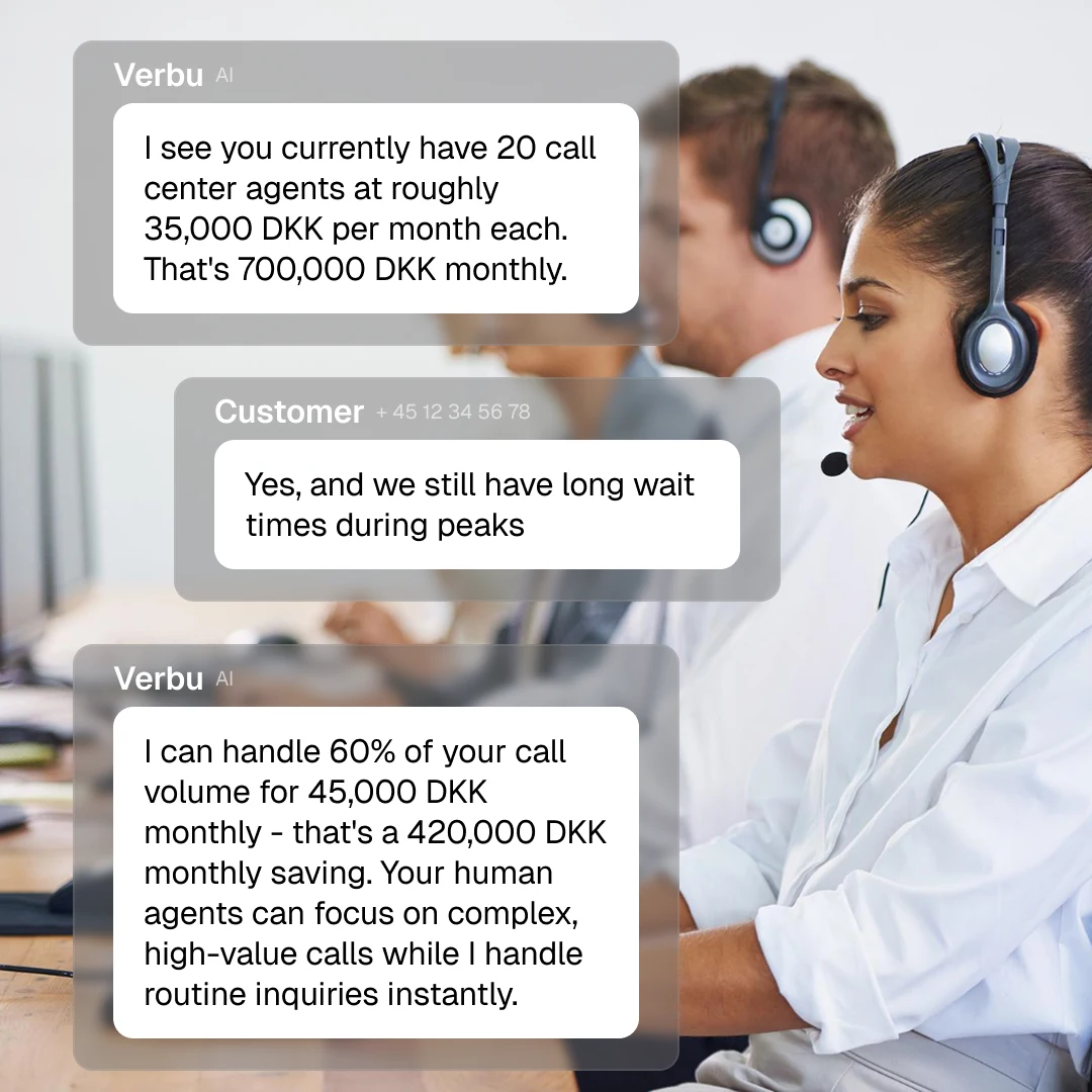 Verbu's AI-powered phone assistant enhances call center operations with intelligent routing, first-level support, and overflow management 24/7. Built for call centers that need to handle more volume while maintaining service quality and reducing operational costs.