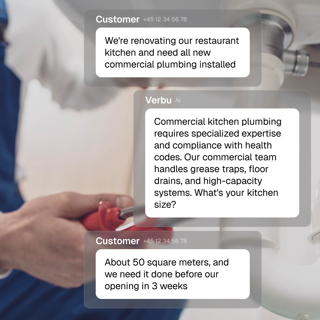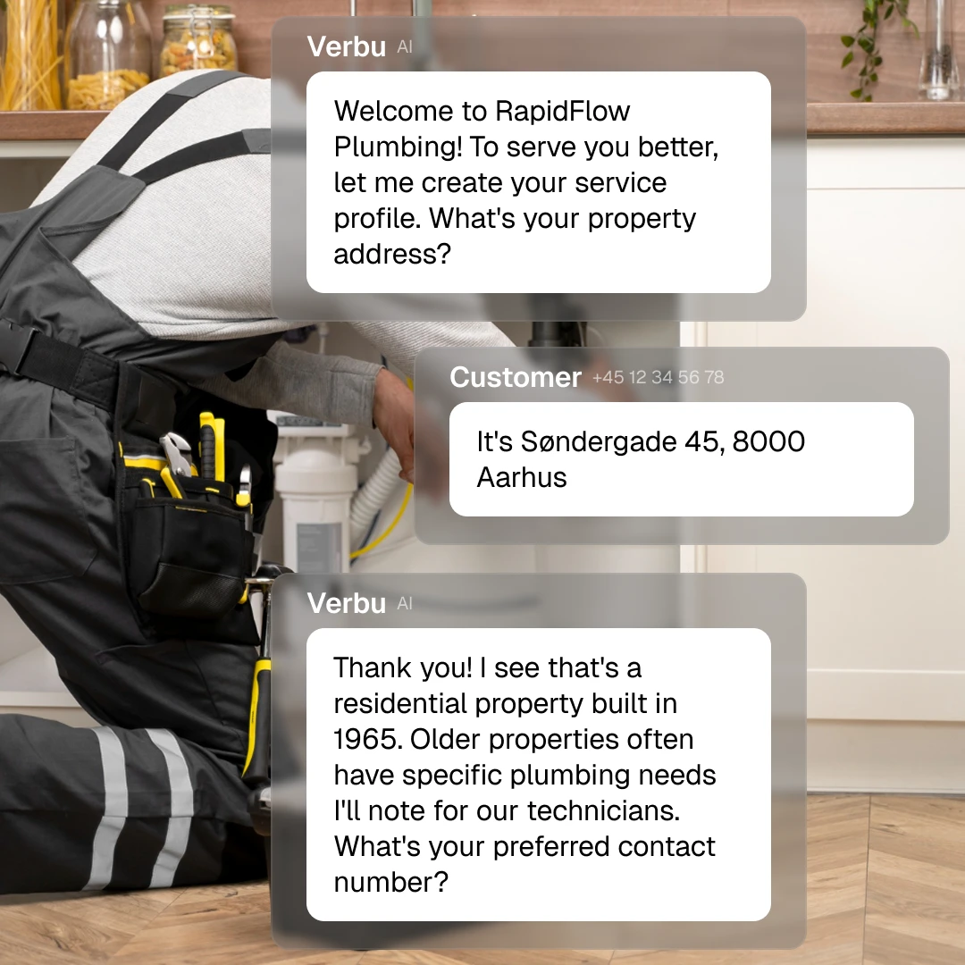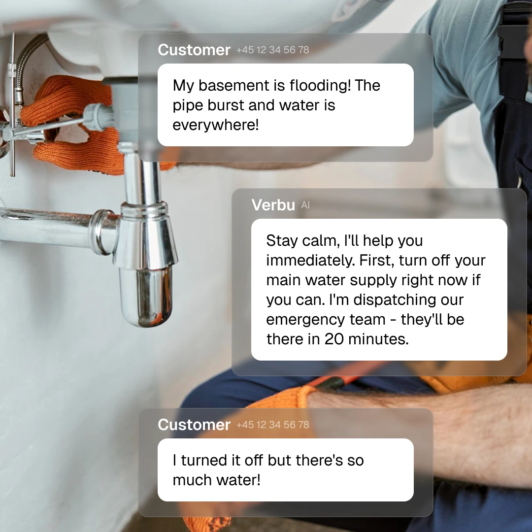 Verbu's emergency response system understands plumbing emergencies and can guide customers through immediate damage control while dispatching appropriate technicians. The system knows the difference between a minor leak and a burst pipe emergency, ensuring proper response timing and technician preparation.