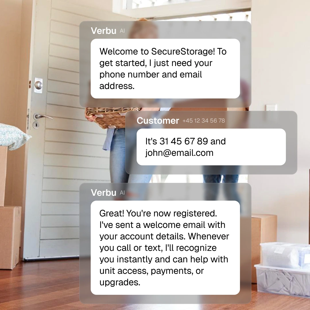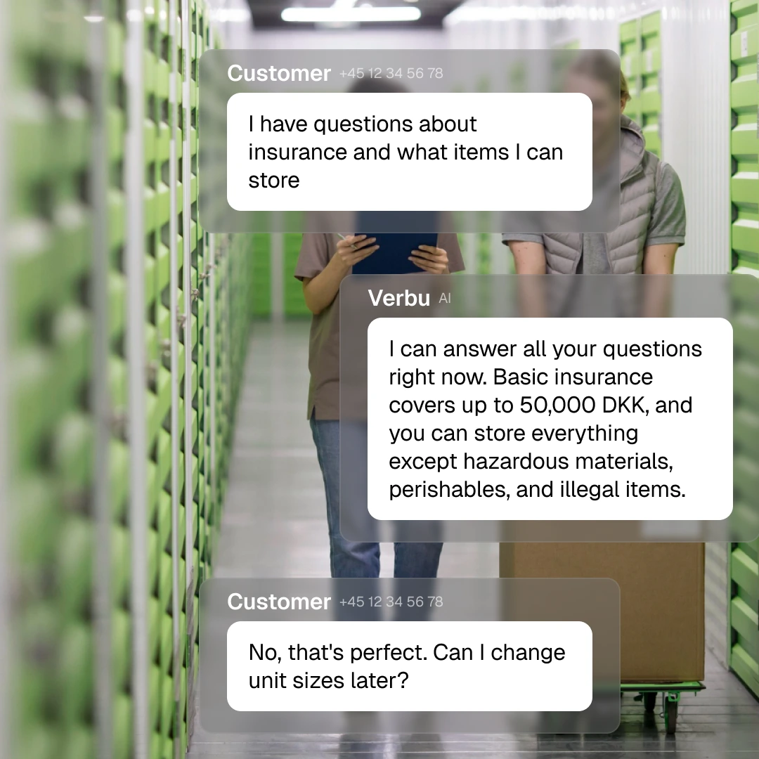 Verbu's storage facility AI understands unit types, sizing recommendations, and rental processes. The system can assess storage needs, check real-time availability, and guide customers through rental applications while integrating with facility management systems to ensure accurate unit assignments and optimal occupancy rates.